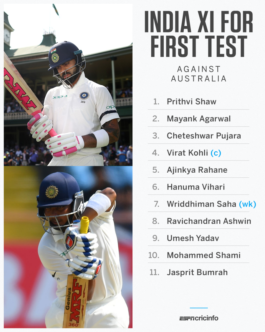 India ha anunciado su equipo para el próximo Test en Adelaide, con Wriddhiman Saha, R Ashwin y Prithvi Shaw en la alineación. Umesh Yadav completa el trío de lanzadores rápidos seleccionados.
