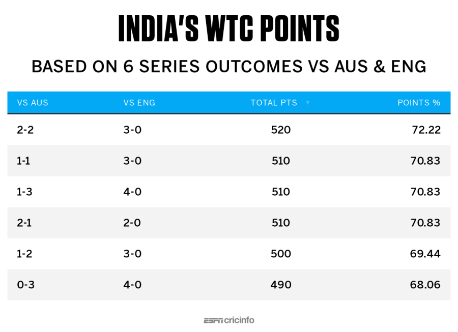 Dado el impresionante historial de India como local, tienen una buena oportunidad de obtener todos los puntos contra Inglaterra. Esto significa que necesitarán al menos una victoria, o tres empates, en las cuatro pruebas en Australia para alcanzar ese objetivo de 150 puntos.