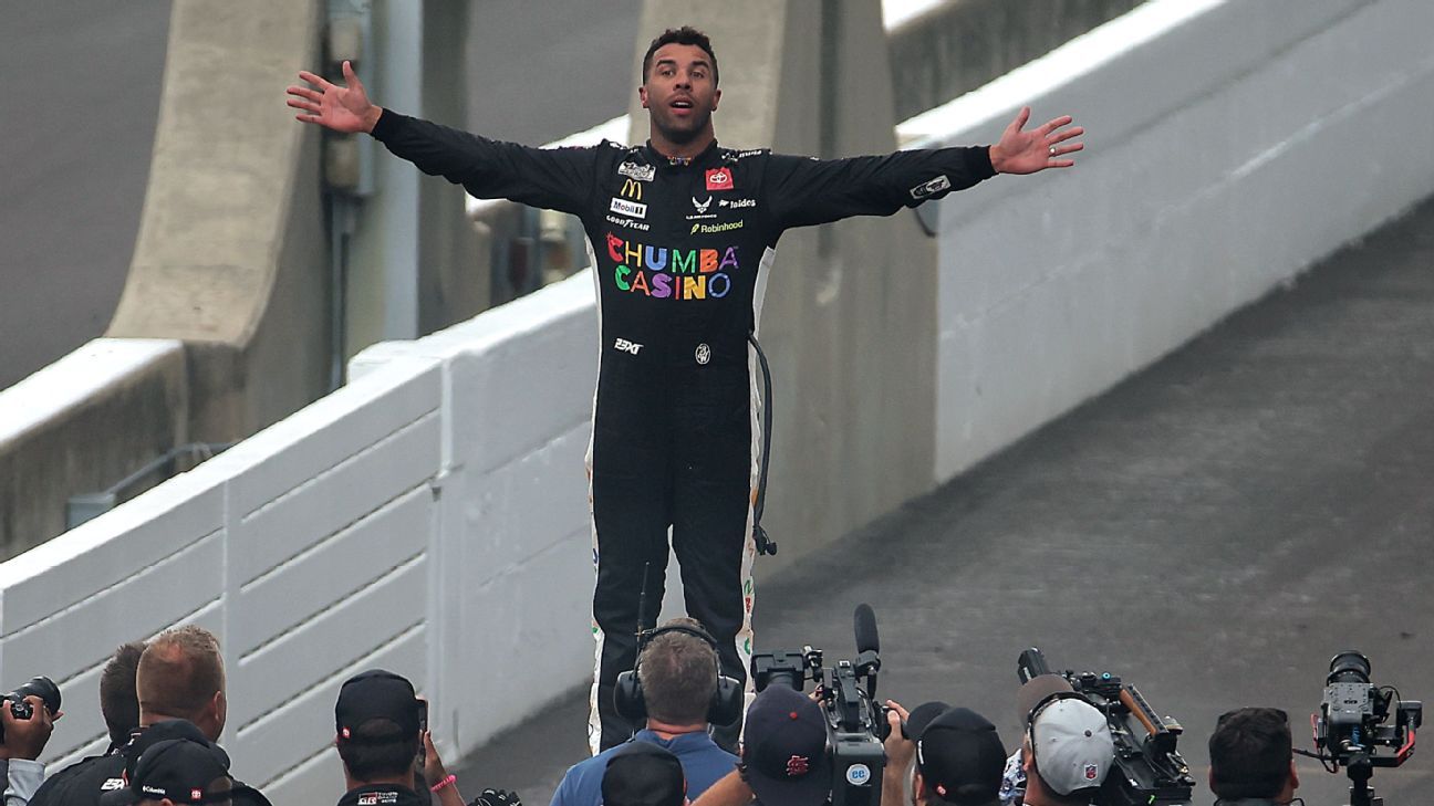 Bubba Wallace celebra su victoria en el Brickyard 400, su primer triunfo en una de las carreras más importantes de NASCAR.Kyle Larson, who was chasing Wallace, got within 5.057 seconds with 14 laps to go, but the gap was reduced to about three seconds when the yellow flag came out due to rain. The cars stopped in the pit lane with four laps remaining, giving Wallace about 20 extra minutes to plan his restart strategy.