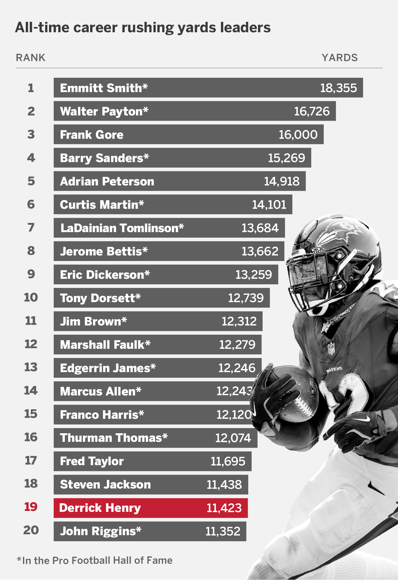 A medida que Henry escala en la lista de corredores de la NFL, el debate sobre su lugar entre los mejores de la historia se intensificará. Su entrenador, John Harbaugh, lo considera en la misma categoría que Jim Brown y otros grandes como Barry Sanders y Walter Payton.